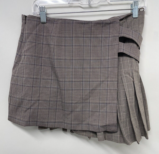 Zara Womens M Check Mini Skirt Beige Plaid High Waist Pleated Side Zip 4661/114
