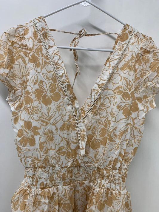 American Eagle Womens M Ivory V Neck Tie Back Tiered Mini Dress Floral Tan Smock
