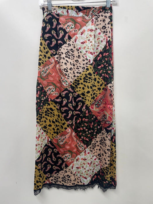 ASOS Women's 4 Satin Crinkle Slip Skirt Multicolor Patchwork Print Lace Hem NWT