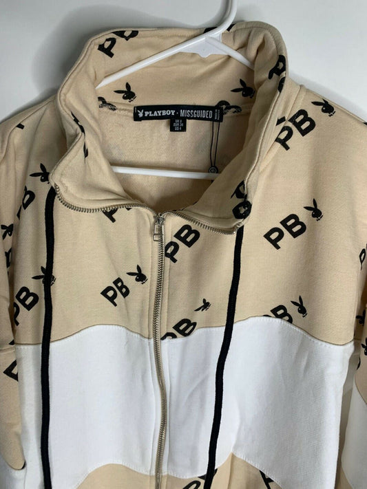 Missguided Playboy W0mens 4 Stone White Color Block Zip Sweatshirt Heatwave AOP