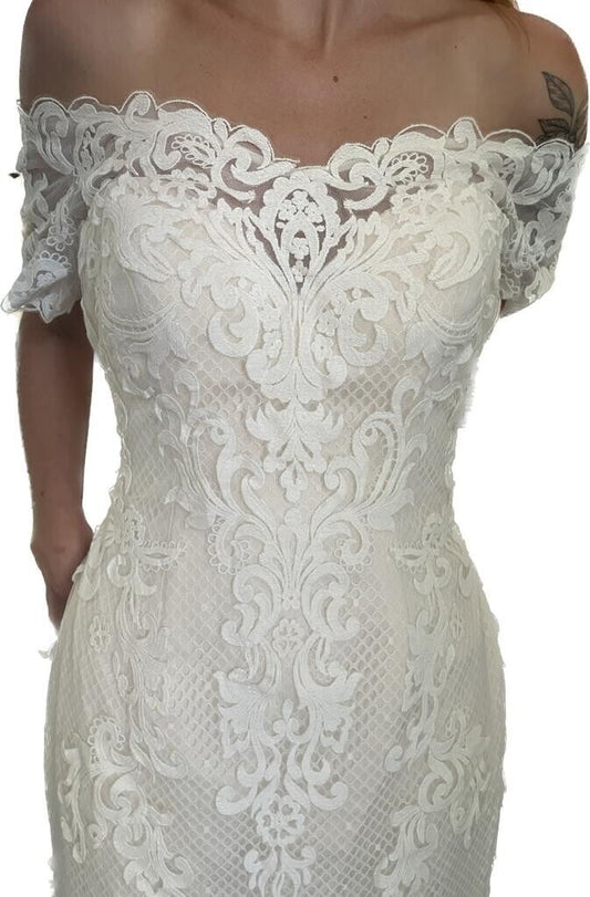 Davids Bridal Womens 10 As Is Off Shoulder Lace Sheath Wedding Dress Gown White