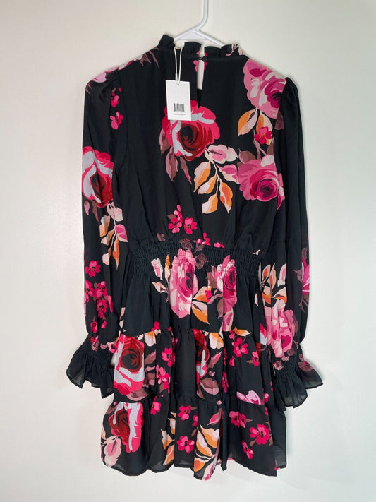Stellah Womens S Elastic Waist Tiered Long Sleeve Floral Mini Dress Black SK8950