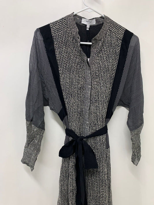 Reiss Womens 4P Tanis Mixed-Print Midi Dress Belted Black White Chiffon L/S
