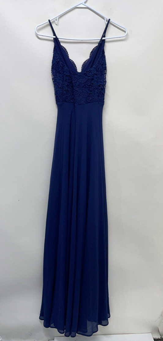 Lulus Womens XS Madalyn Crochet Lace Maxi Dress Navy Blue Chiffon V-Neck 27536