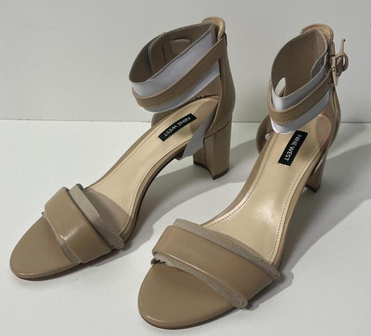 Nine West Women's 8.5M Pruce Ankle Strap Block Heel Leather Sandals Natural