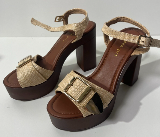 Madden Girl Women's 7 Vivv Buckled Wooden Platform Dress Sandals Natural Raffia
