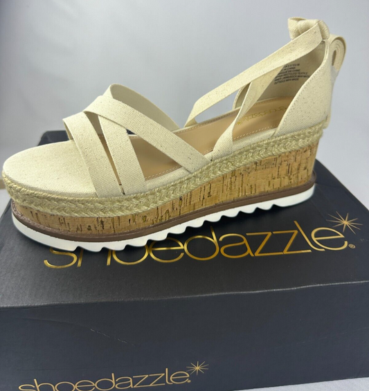 ShoeDazzle Womens 8.5 Tandace Lace Up Linen Platform Wedge Sandals Cork Beige