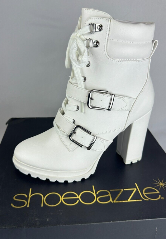 Shoe Dazzle Womens 9 Analisa Ankle Bootie Lace-Up Block Heel Lug Sole White Boot