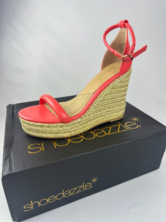 ShoeDazzle Womens 8 Jenna Buckle Hot Coral Espadrille Wedges Sandals Heels