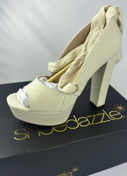 ShoeDazzle Womens 9 Takkara Natural Linen Platform Block Heels Open Toe