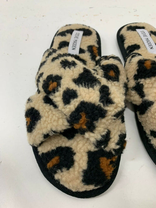 Steve Madden Women Leopard Print Criss Cross Slippers Sandals Peaceful Fuzzy