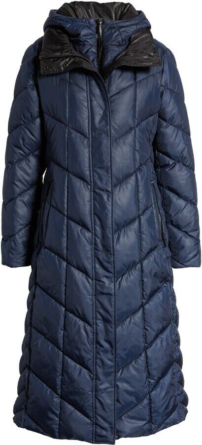 Gallery Womens M Navy Blue Long Hooded Puffer Coat Parka Polyester Fill Quilted