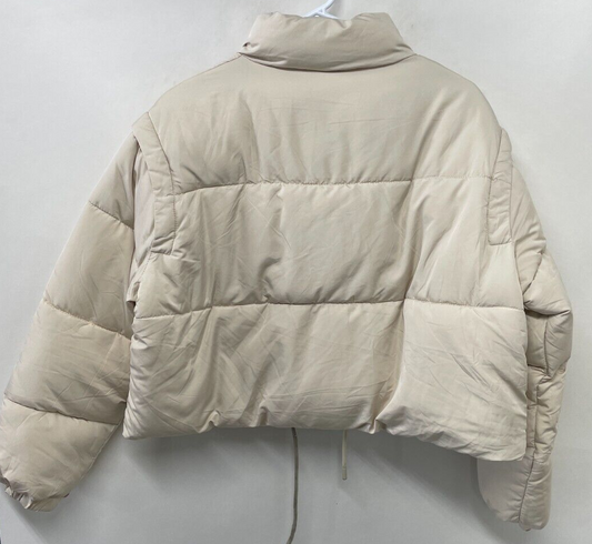 Berska Womens L Cropped Puffer Jacket Beige Snap Button Zip Pockets Long Sleeve