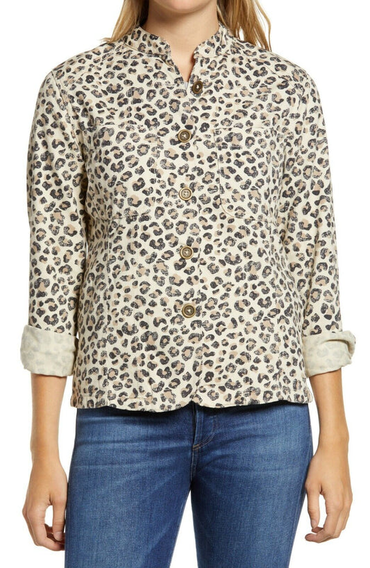 Caslon Womens XS Beige Leopard Distress Utility Shirt Jacket Mandarin Collar
