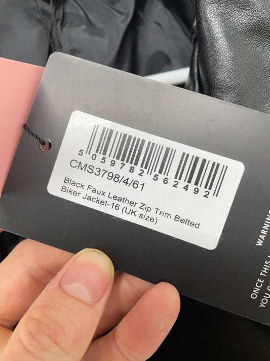 PRETTYLITTLETHING Women's 12 Faux Leather Zip Trim Belted Biker Jacket Black NWT