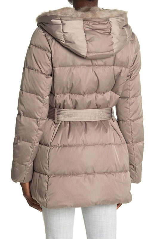 Tahari Womens L Taupe Michelle Faux Fur Puffer Jacket Belted Shawl Gray Coat