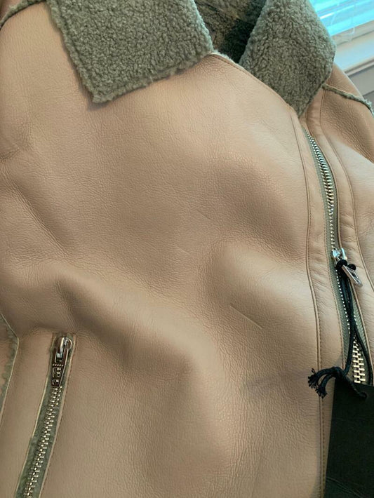 Democracy Womens M Pebble Beige Shearling Faux Fur Jacket Stand Collar Plush