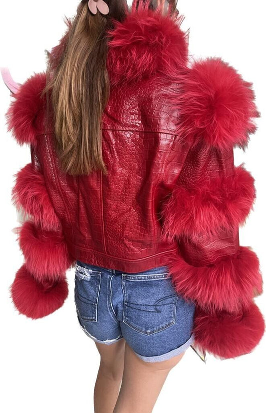 Paisleys Luxe Boutique Womens S Valentine Red Leather Racoon Fur Croc Jacket