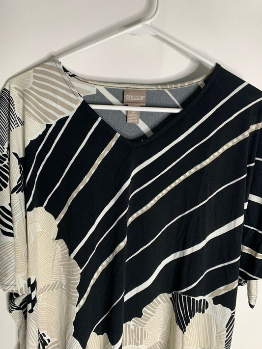 Chicos Women 2 Striped Floral Split Shoulder V Neck Black Neutral Grommet Sleeve