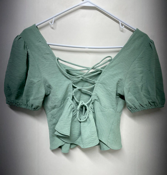 Altar'd State Women S Puff Sleeve Lace Back Crop Top Sage Green Peplum BE22780