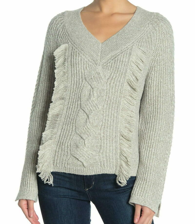 Abound Womens L Heather Gray Cable Knit Fringe Pullover Sweater Gray V-Neck