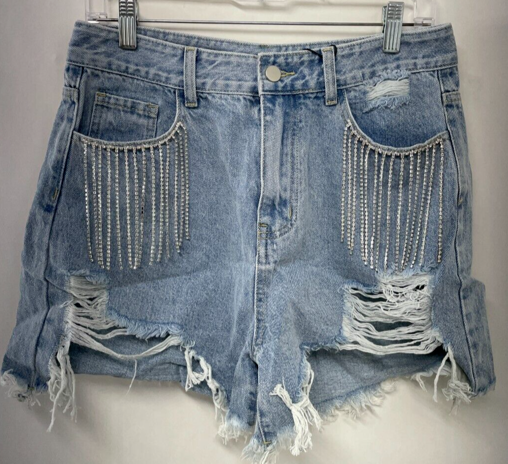 Cider Women's L Diamond Tassels Ripped Denim Shorts Blue Cotton Distressed Jean