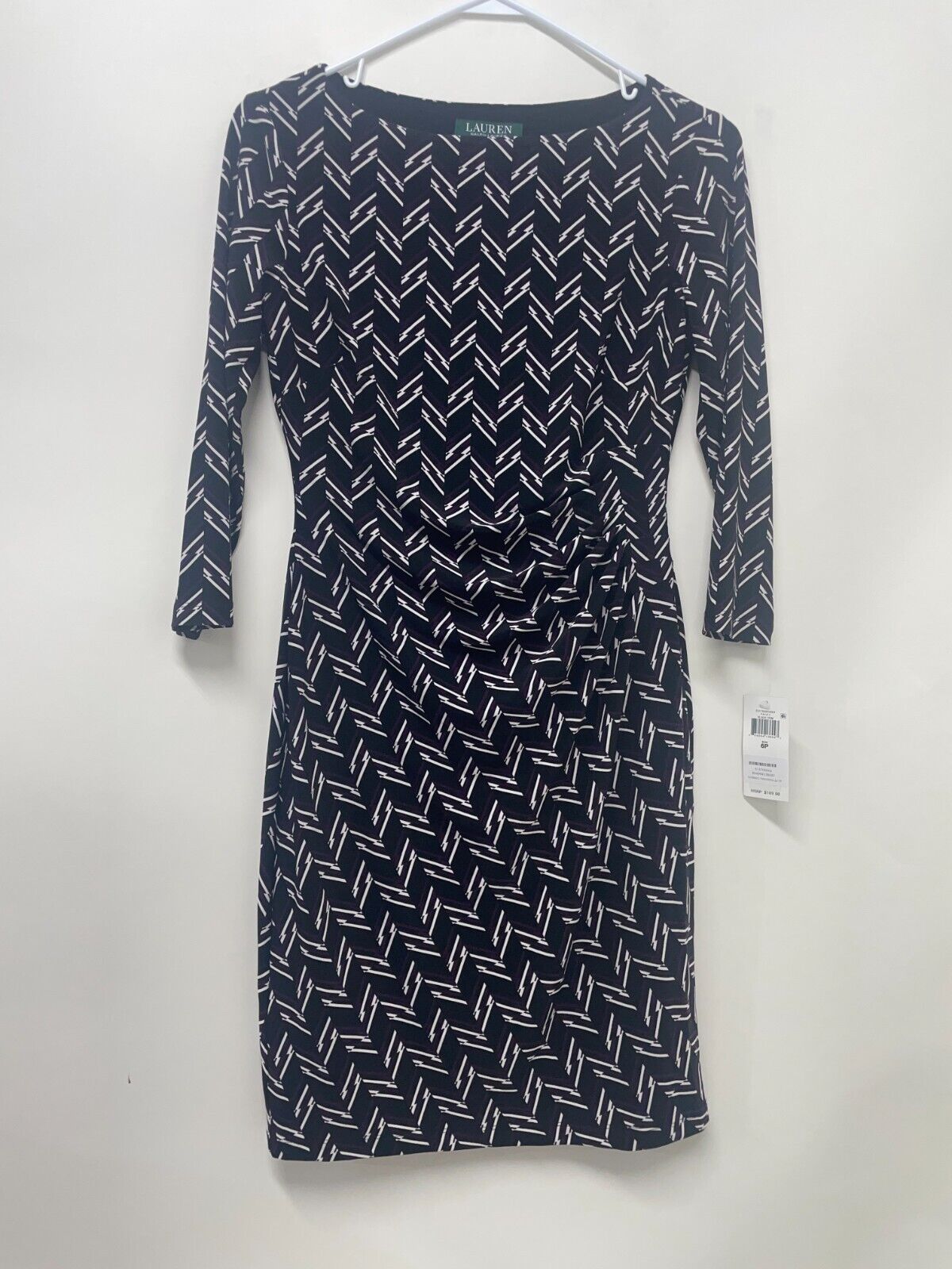 Lauren Ralph Lauren Womens 6P Jersey Printed Dress Black Cream Ruched Boat Neck