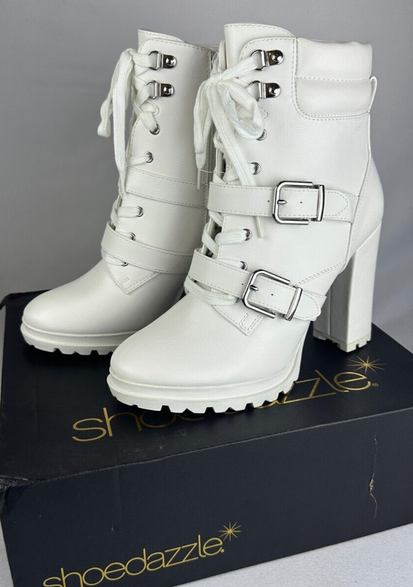 Shoe Dazzle Womens 9 Analisa Ankle Bootie Lace-Up Block Heel Lug Sole White Boot
