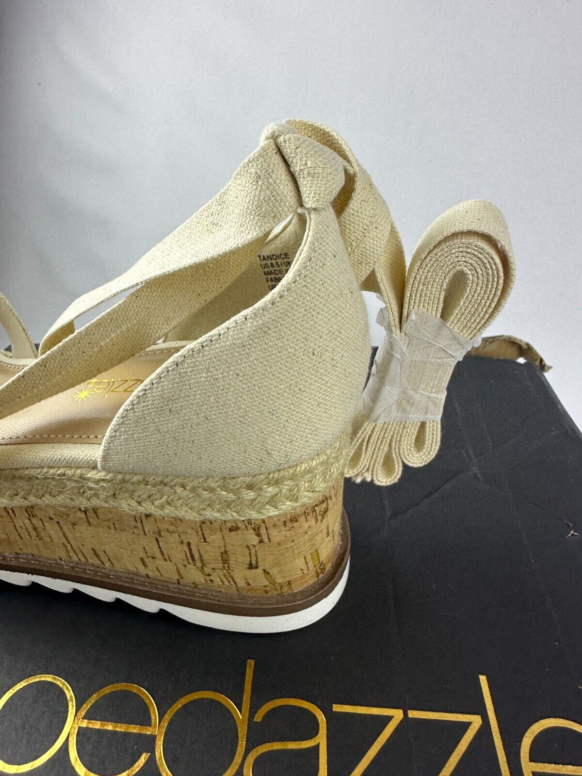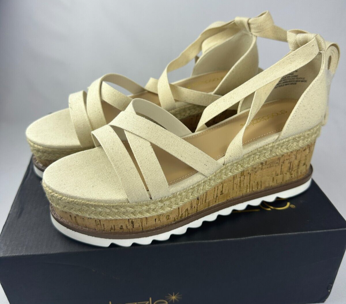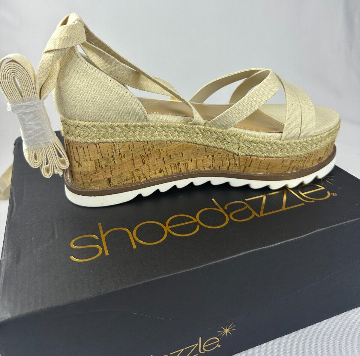 ShoeDazzle Womens 8.5 Tandace Lace Up Linen Platform Wedge Sandals Cork Beige