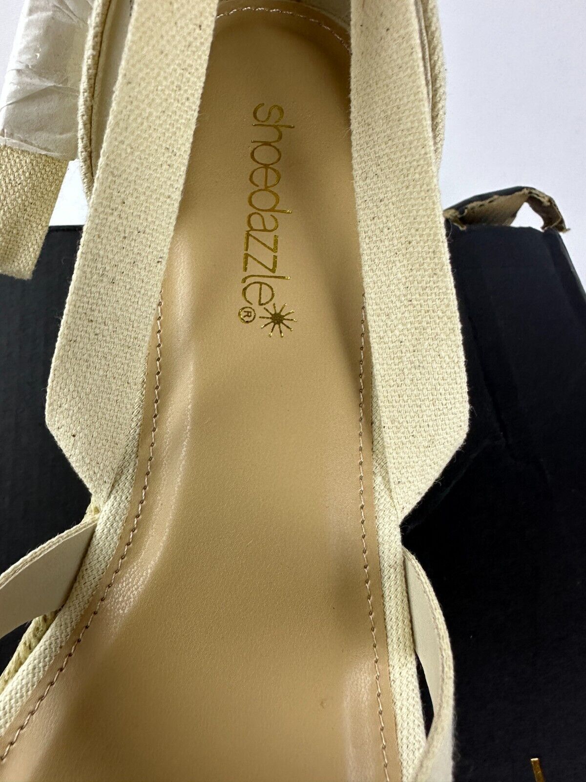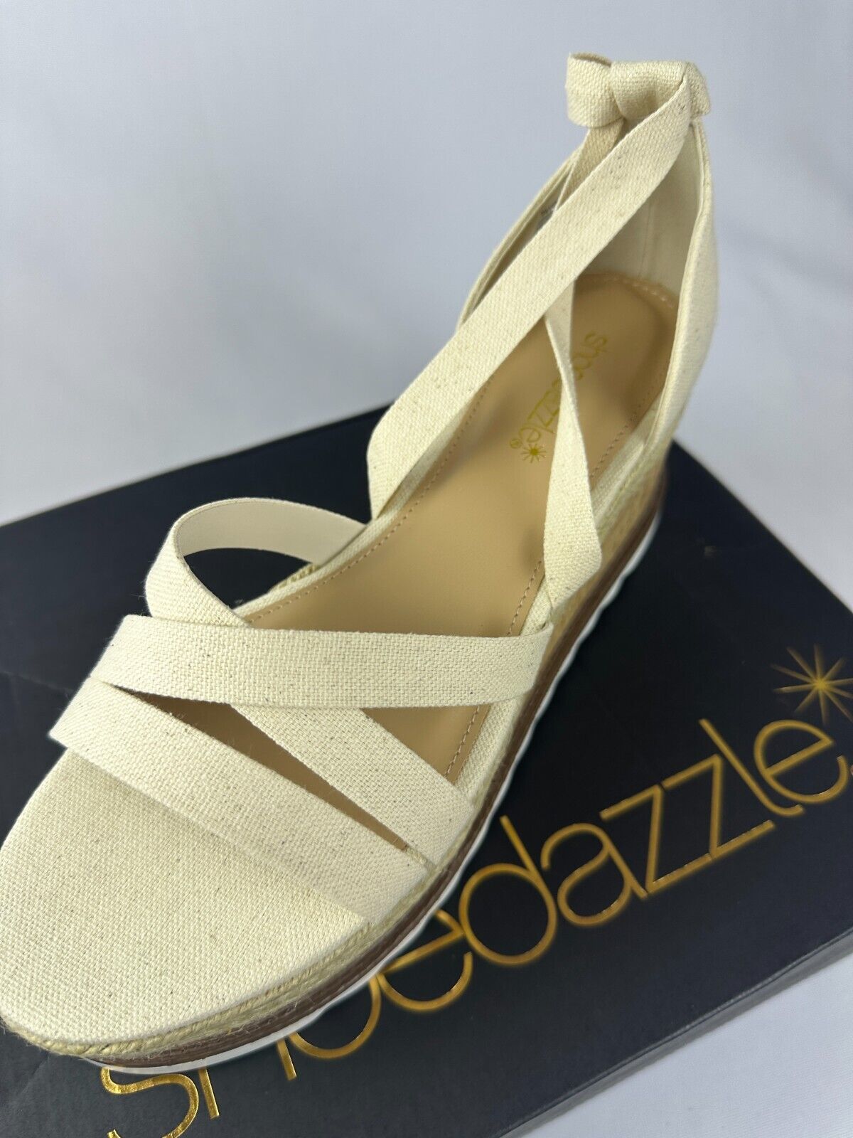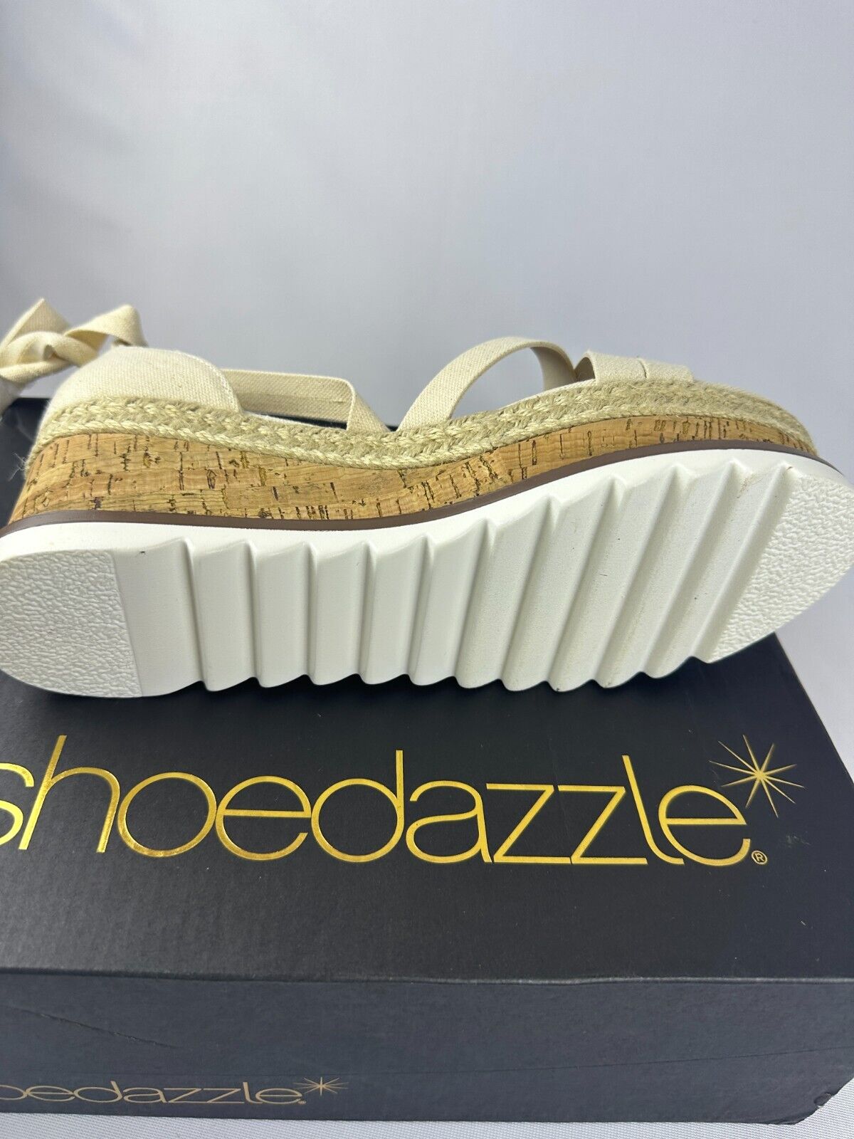 ShoeDazzle Womens 8.5 Tandace Lace Up Linen Platform Wedge Sandals Cork Beige