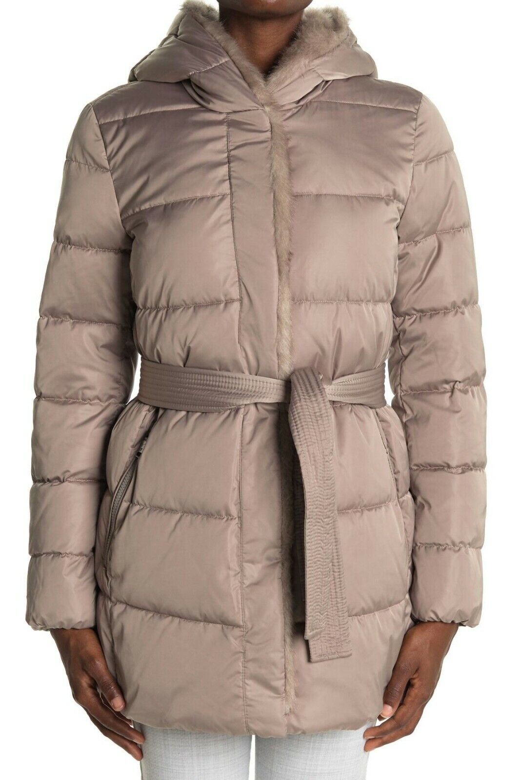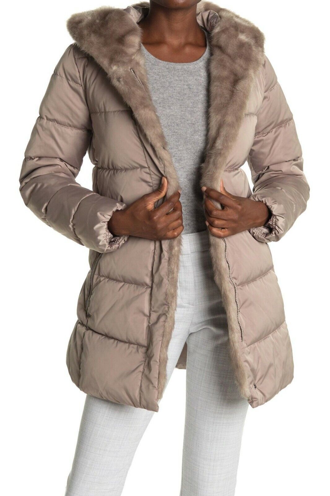Tahari Womens L Taupe Michelle Faux Fur Puffer Jacket Belted Shawl Gray Coat