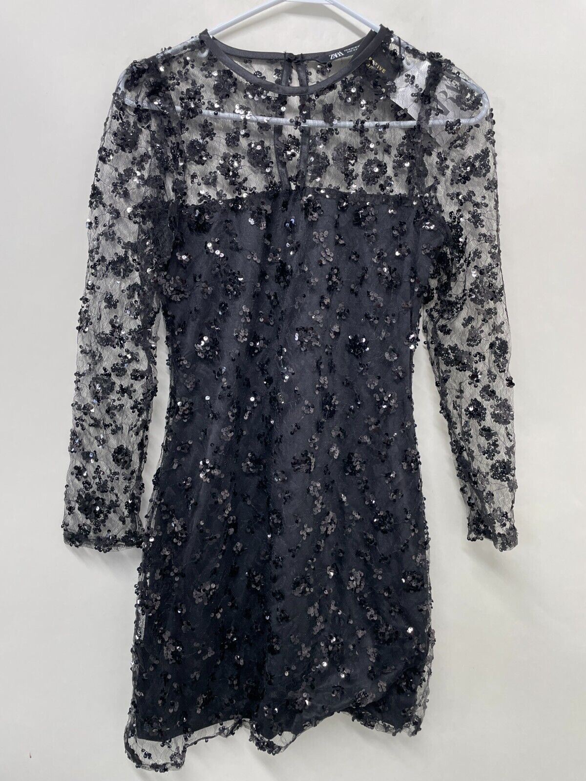 Zara Womens M Short Sequin Cocktail Dress Black Sheer Long Sleeve 0387/191/800